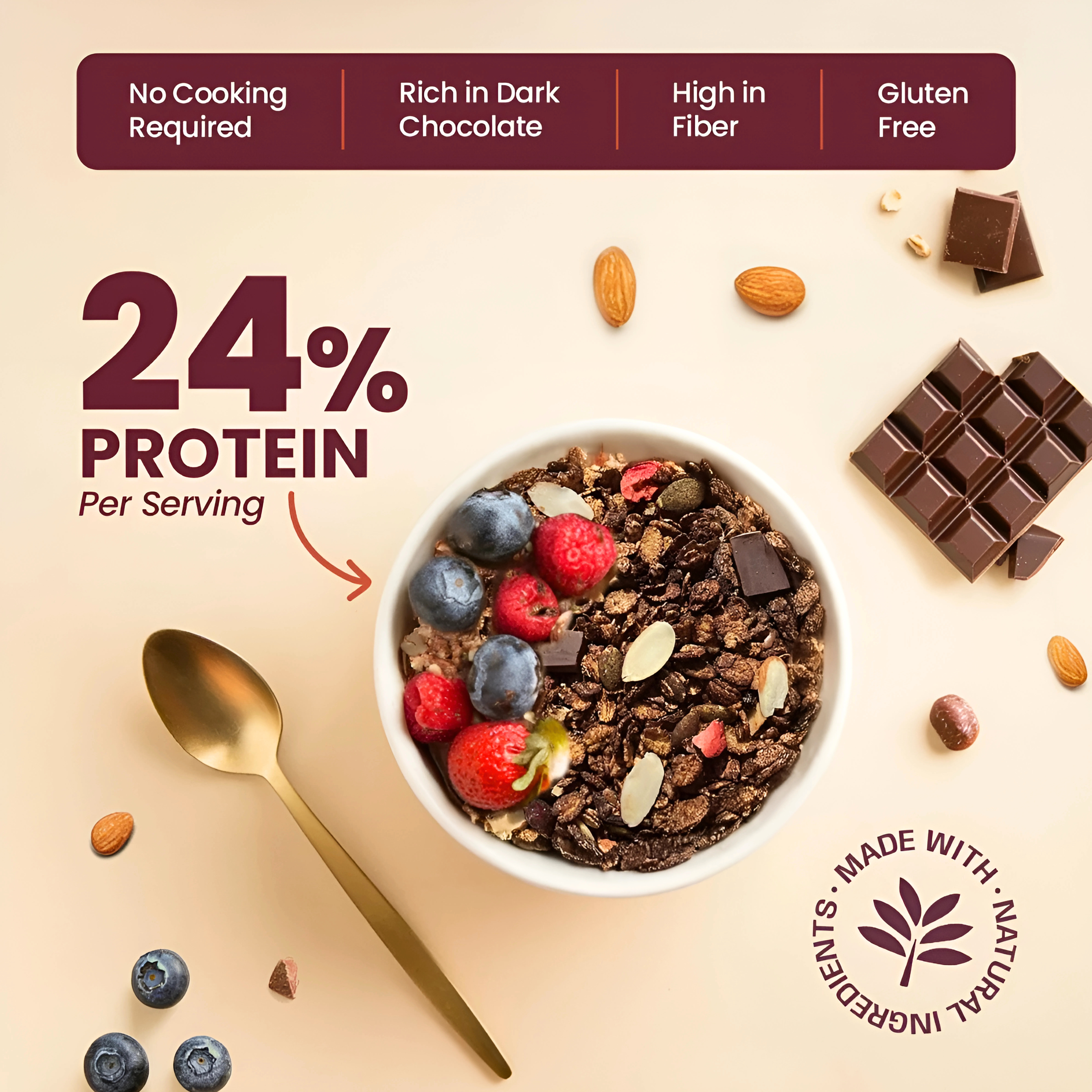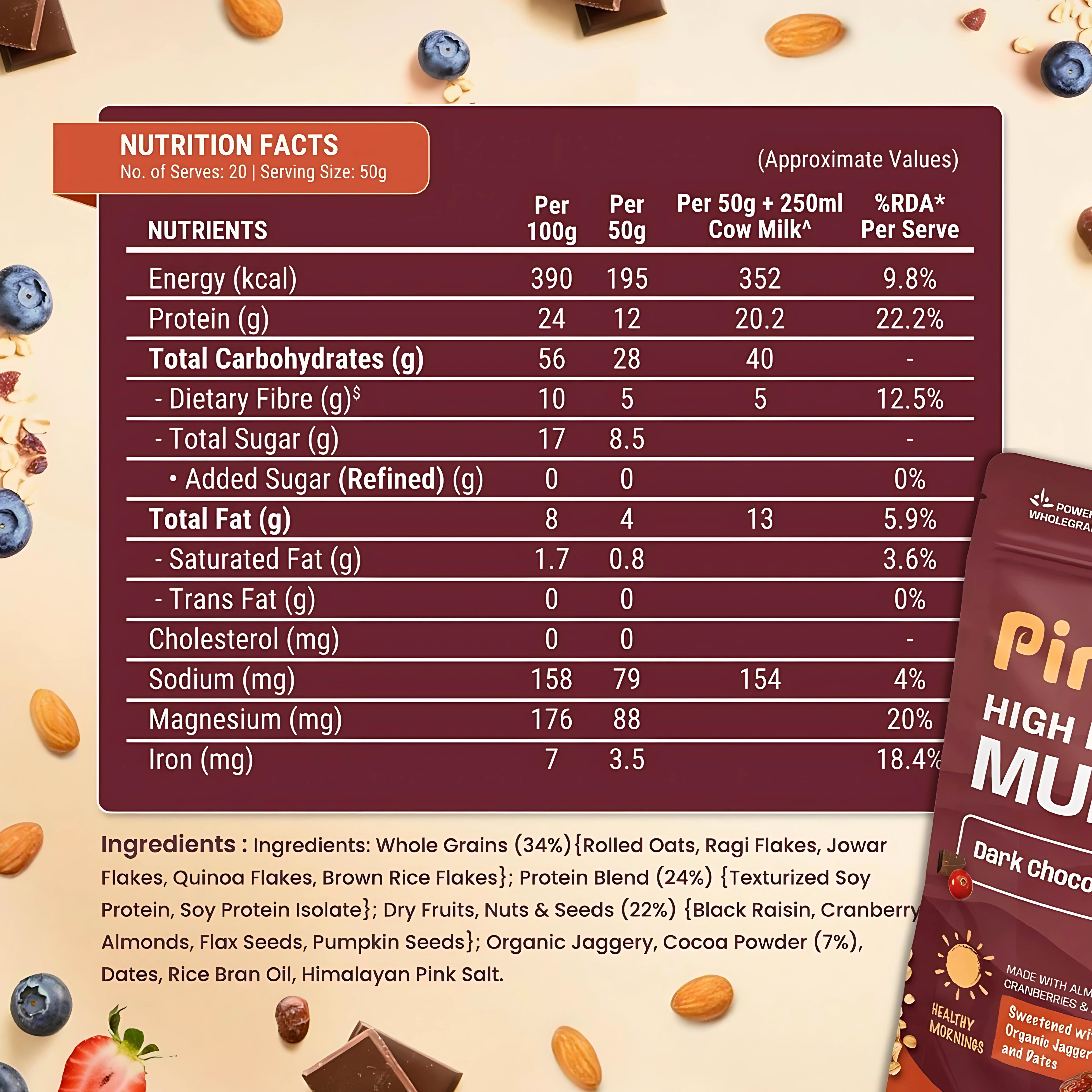 Start your mornings with a power-packed breakfast that fuels both body and mind. Pintola High Protein Muesli is a perfect blend of rolled oats, quinoa, ragi, jowar, brown rice flakes, almonds, cranberries, pumpkin seeds, flax seeds, and rich dark chocolate – designed for those who demand both nutrition and taste in every bite.
